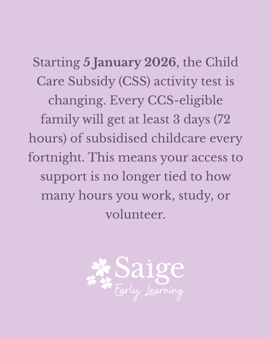 The exact amount of subsidy you will receive is calculated based on your family’s circumstances, including income, the number of children in care, and the type of care. You will be notified of your subsidy rate once Services Australia processes your application. Use the CCS calculator to find out how much you can save at Saige Early Learning.